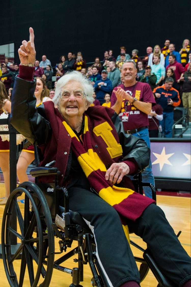 她在全美被广泛报道是因为在2018年,她随校队出席疯狂三月赛事,那一年他们成为黑马打进了最终四强。而Sister Jean在比赛中因为赛前带队祈祷、坐在场边鼓励球员、给他们精神支持而受到了广泛关注。